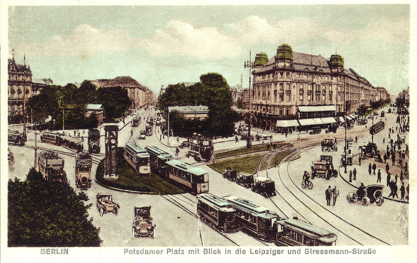 Forse non tutti sanno che in questa piazza è stato utilizzato il primo semaforo del mondo (non per niente nei negozi di souvenir trovate dappertutto gli omini neri su sfondo rosso e verde!). Nozioni da guida turistica a parte, questa piazza è un punto nevralgico della Berlino ante-1939, un animato crocevia dove già nel 1908 transitano 35 linee tranviarie ed è insediata la stazione di testa di una delle più importanti linee ferroviarie nazionali e internazionali. Potsdamer Platz in questa fase è dunque il simbolo della modernità e della vivacità economica della capitale tedesca.