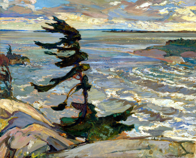 Tutto inizia circa così, per farla molto veloce: una sera del 1913 il pittore canadese Lawren Harris invita altri sei colleghi (J.E.H. MacDonald, Arthur Lismer, F.H. Varley, Frank Carmichael e Frank Johnston, che abbandonerà la prima sera) a casa sua, per parlare di un futuro comune all’insegna dell’arte. Nasce quindi il Gruppo dei Sette, a cui si aggiunge presto Tom Thomson, un gruppo che organizza delle esposizioni e che lavora unito per rappresentare la natura artica (e pre-artica) in tutte le sue sfumature.
