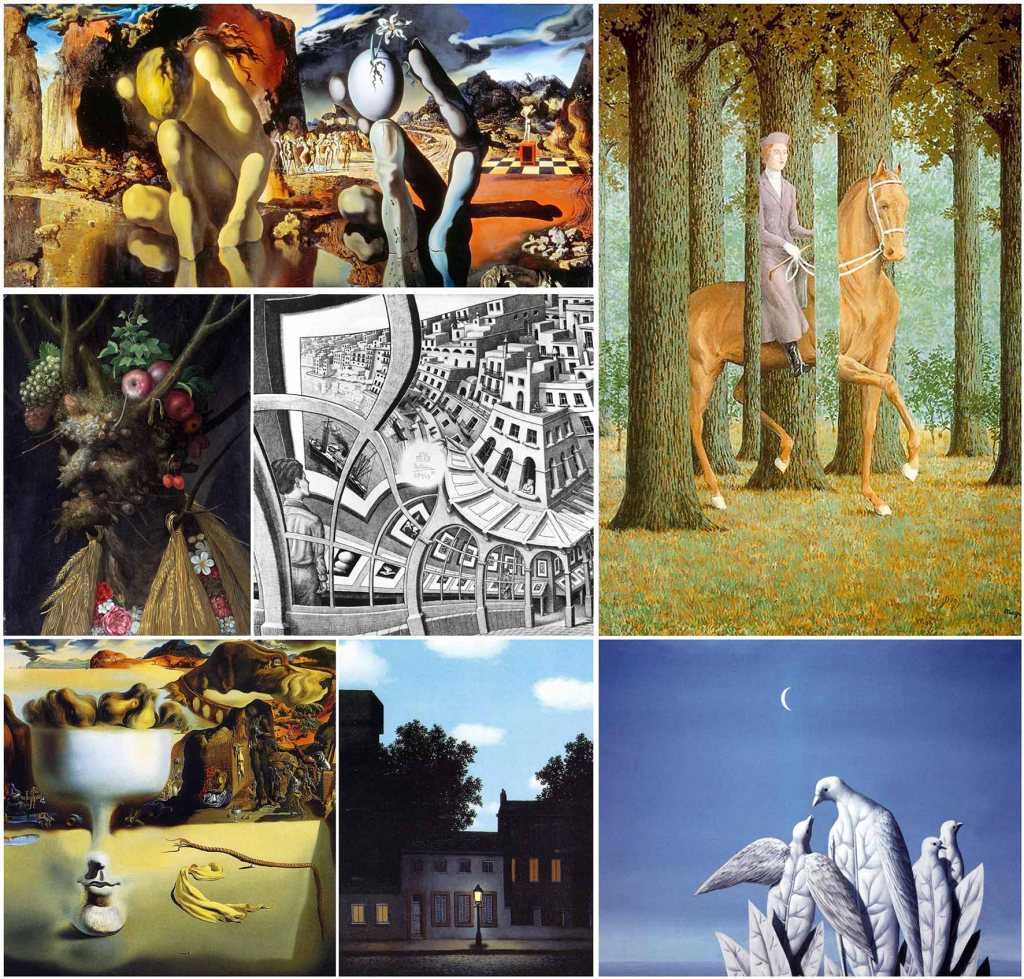 In questa selezione trovate i maestri del surrealismo ma non soltanto: una piccola deviazione vi condurrà dal precursore Arcimboldo e dall’ultimo venuto, quel grande genio di Escher, per cui vi confesso che ho un debole di vecchia data.