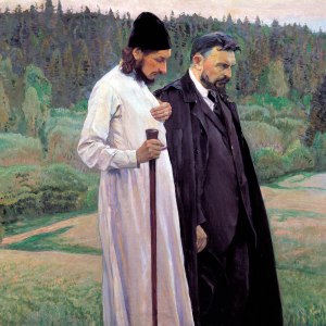 Mikhail_Nesterov_i filosofi-1917-Florensky_Bulgakov