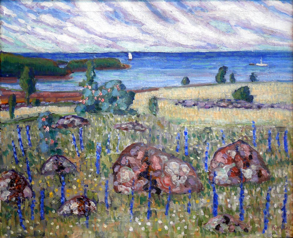 Il blu dei fiori che richiama quello del mare all’orizzonte: anche secondo voi si tratta di una delle caratteristiche più interessanti di questo dipinto di Konrad Magi (1878-1925), artista lettone davvero interessante?