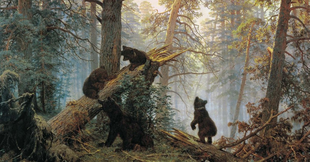 Forse perché c’è un certo effetto sorpresa causato dalla scelta degli animali ritratti, che non sono i soliti cani e gatti, ma carinissimi cuccioli di orso bruno in compagnia della loro mamma, o forse perché i quattro protagonisti di Mattino in una pineta di Ivan Šiškin ci raccontano una scena che per noi italiani del XIX secolo è particolarmente inusuale.