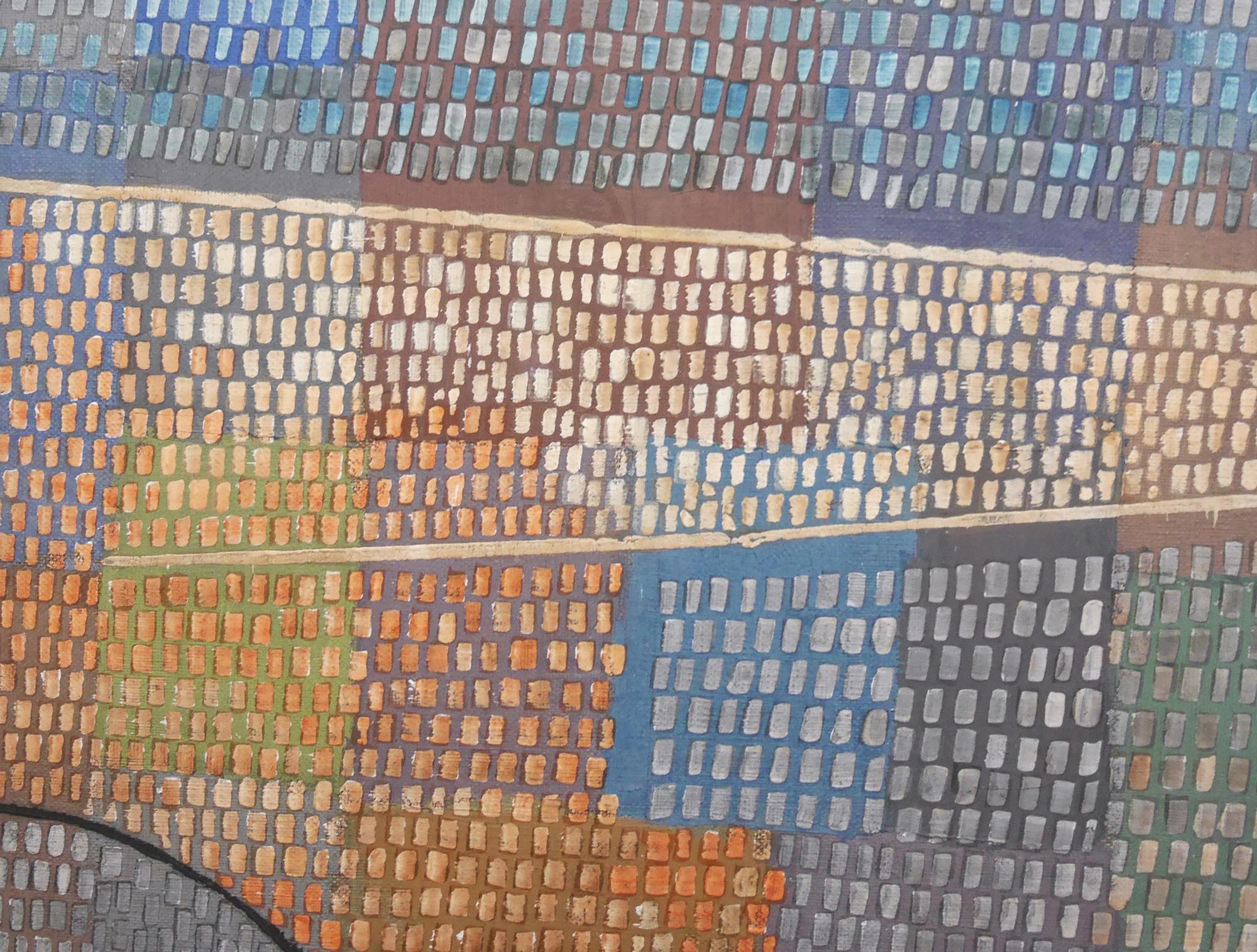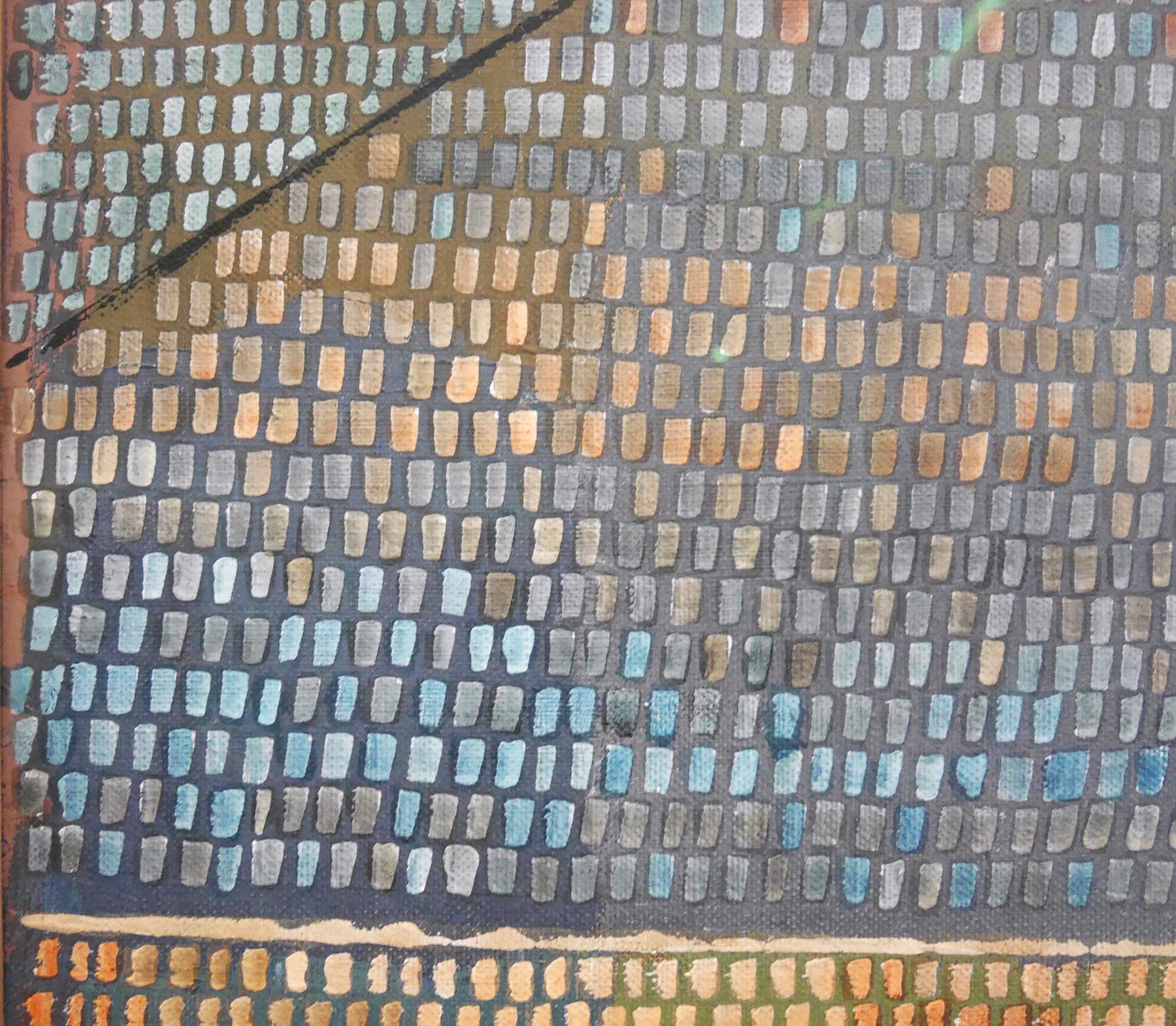 In pratica, questo quadro è originato da uno strato di quadrati colorati, su cui sono stati dipinti piccoli punti luminosi, insieme al cerchio arancione e alle linee, elementi basilari ma allo stesso tempo evocativi, capaci di trasformare una composizione astratta in qualcosa di fortemente comunicativo.