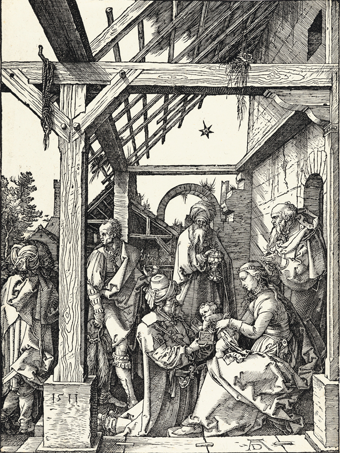 Pochi anni più tardi, nel 1511, Albrecht Dürer, il maestro di Norimberga, incide in xilografia, la matrice su legno, lo stesso tema. Lo sviluppo è ancora una volta verticale, ma la Vergine e i personaggi sono di profilo e Durer utilizza la struttura architettonica della capanna per fare una quinta teatrale in cui inserire la scena. Un basamento tra due colonne separa lo spazio dell’arte da quello dello spettatore. Il segno xilografico è ai massimi livelli, Durer utilizza un tono medio per definire lo spazio tra le figure in primo piano e quelle sullo sfondo. Da una base omogenea “grigia” ricava zone d’ombra e di luce per definire volumi, oggetti e volti. La rappresentazione della corda annodata è un vertice tecnico-compositivo unico.