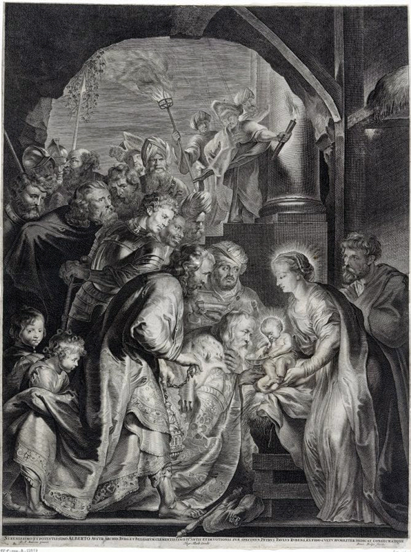Nel ‘600 la tecnica dell’incisione a bulino raggiunge i massimi vertici con la scuola di Rubens. Lucas Vorsterman incide l’adorazione dei Magi derivata proprio dal maestro di Anversa. La composizione mostra i Magi e la Sacra Famiglia in primo piano in un interno. Dietro di loro una folla di personaggi cerca di sporgersi per osservare meglio la scena. A illuminare la scena, un notturno, sono due figure che tengono in mano le torce. Il bulino diventa quasi uno strumento pittorico nella resa di toni e tinte. Il segno varia sia nella larghezza che nella pressione. L’incisore combina l’uso del puntinato con profondi tratti, molto vicini, per ottenere gradazioni di grigio fino al nero intenso. Anche nei toni medi la descrizione di abiti ed espressioni è sorprendente.