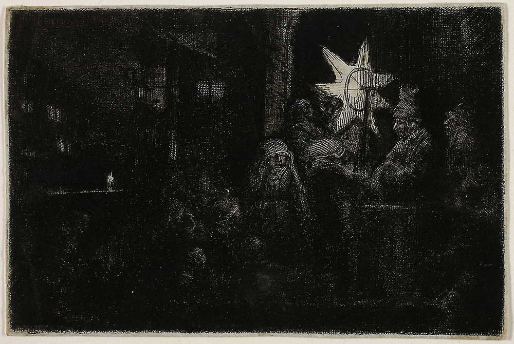 Chi ha affrontato il tema secondo una prospettiva personale e del tutto innovativa è Rembrandt. L’artista non presenta la solita scena, bensì segue la tradizione olandese. Il 6 gennaio gruppi di bambini e adulti attraversavano la città di notte per raccogliere dei doni. Ogni gruppo aveva con sé una lanterna di carta a forma di stella, proprio per rievocare l’episodio della stella che condusse i magi a Betlemme. Rembrandt rappresenta l’episodio al buio, la luce della stella permette di scorgere i personaggi, mentre sullo sfondo si vedono alcune finestre da cui filtra la luce. Un’altra stella illumina una piccola via in lontananza che rischiara anche altre case. Il segno all’acquaforte è molto fitto, denso, vellutato. Il nero predomina, ma non è mai uniforme. È tonale. Dal buio emergono gli elementi, un processo compositivo in cui tutto si svela piano piano.