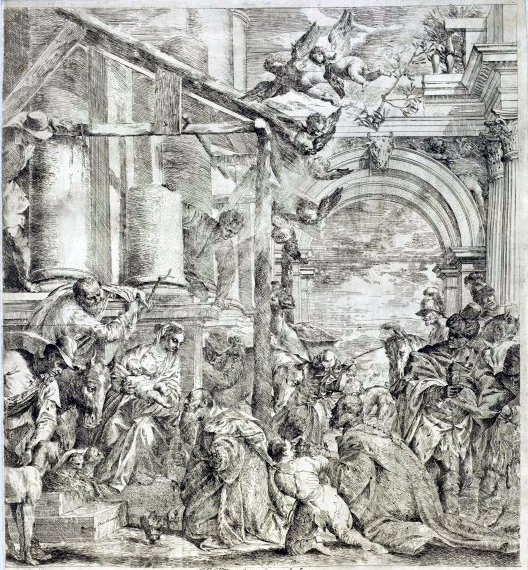 In questo viaggio nell’iconografia dell’adorazione dei Magi, presentiamo anche un lavoro di un autore meno noto, la cui opera deriva da un dipinto di Veronese ora alla National Gallery. Carlo Sacchi nel 1649 intaglia questa lastra all’acquaforte, la tecnica indiretta ottenuta con le morsure di acido. L’impostazione è scenografica, con incredibili effetti di luce nella resa del raggio diagonale che attraversa l’opera.