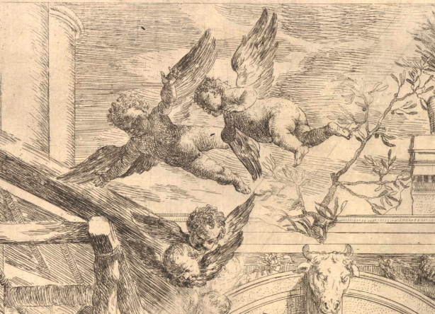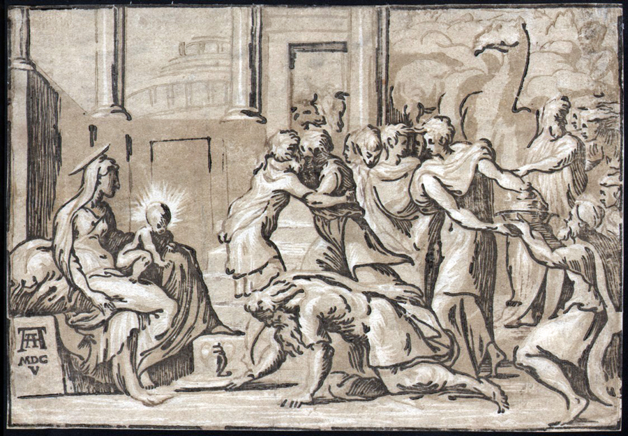 In Italia, nel pieno Cinqecento, Niccolò Vicentino intaglia un chiaroscuro derivato da un soggetto di Parmigianino. La tecnica si ottiene dalla sovrapposizione di più matrici in legno che generano più colori sul foglio. Le figure sono tipiche del Manierismo: i corpi sono allungati, le posture serpentinate e sinuose. Il blocco di legno bianco restituisce colpi di luce come fosse biacca sul dipinto.