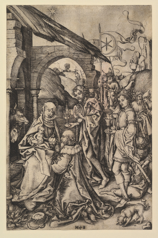 Martin Schongauer è stato uno dei primi incisori a rappresentare a bulino, l’incisione diretta su rame, l’adorazione dei Magi. Eseguita fra il 1470-78 circa, l’opera ha un’impostazione nordica e tardogotica. La scena è ambientata all’interno di rovine classiche ed è caratterizzata dall’assenza di San Giuseppe. Lo sviluppo è verticale e le tre figure dei Magi sono centrali nella composizione. Il segno indaga la ricchezza dei doni, i dettagli e l’eleganza degli abiti. Schongauer ci mostra i minimi particolari, come gli speroni e il copricapo posato a terra, il cane, la pianta e il corteo pronto ad omaggiare Gesù. I segni del bulino hanno un vocabolario ampio: diventano allungati per la descrizione della capanna, si addensano per creare ombre, mentre la pressione varia per la morbidezza delle vesti. Una scena di corte in un contesto nordico di fine ‘400.