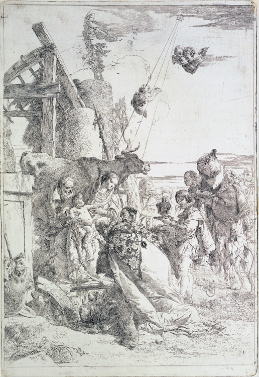 Chiudiamo questo piccolo viaggio nel tema dell’Epifania con l’adorazione di Magi di Giambattista Tiepolo. La luce è protagonista indiscussa di questo lavoro, tanto che intere aree vengono lasciate bianche, prive di morsura dell’acquaforte. Il segno è spezzato, i contorni non chiudono mai le figure, la luce filtra, irradia le figure. L’iconografia è classica, ma grazie a trame rapide e vibranti, tratti febbrili, Tiepolo riesce a creare un’atmosfera sospesa, moderna, in cui illusione e realtà si fondono alla perfezione.